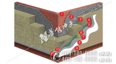 巖棉外墻外保溫系統(tǒng)采用粘結(jié)與錨拴、錨固相結(jié)合的方式,由粘結(jié)層、巖棉板保溫層、錨固件、內(nèi)置玻璃纖維網(wǎng)布的加固層及飾面層組成。